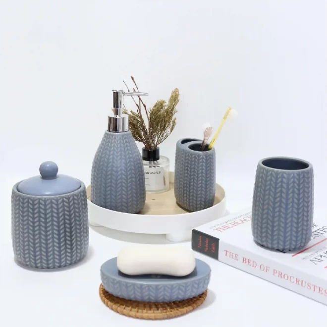 - Exquisite Texture: The blue bathroom accessories set wholesale features a knitted texture design on the surface, adding visual layering and fun, breaking the monotony of solid color ceramics. This unique texture makes the set more artistic and exquisite, becoming a decorative highlight in the bathroom.