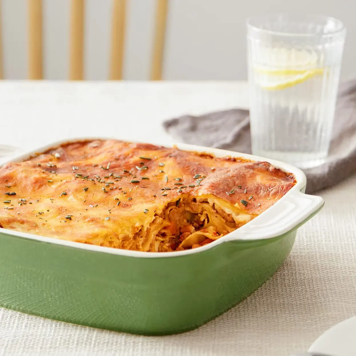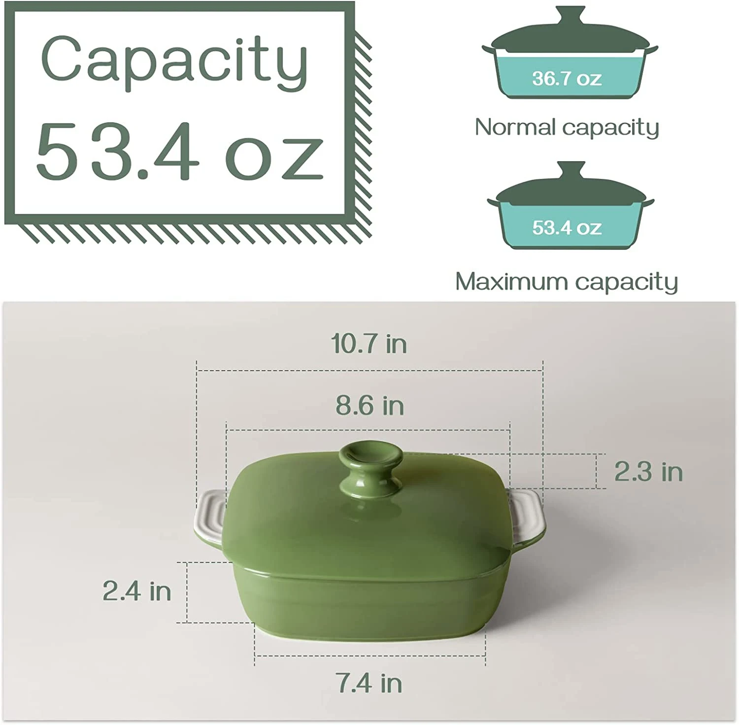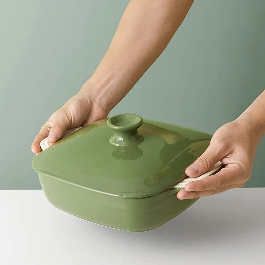 - تصميم أنيق: The wholesale oven casserole dish with lid features a contrasting color design with a vintage olive green outer wall and a white inner wall. This natural and gentle colour scheme provides a new energy in the kitchen and warms the heart when cooking.