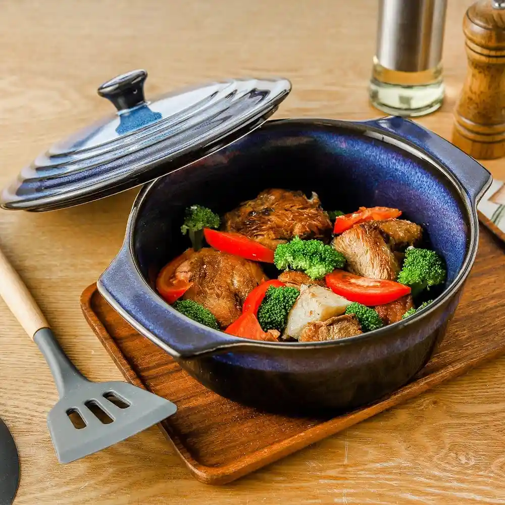 - Reaktive Glasur: These customized casserole dishes feature a unique blue black gradient glaze design. The use of reactive glaze technology in the manufacturing process endows each baking dish with unique color depth and texture, full of artistic sense, avoiding the monotony of industrial mass production.
