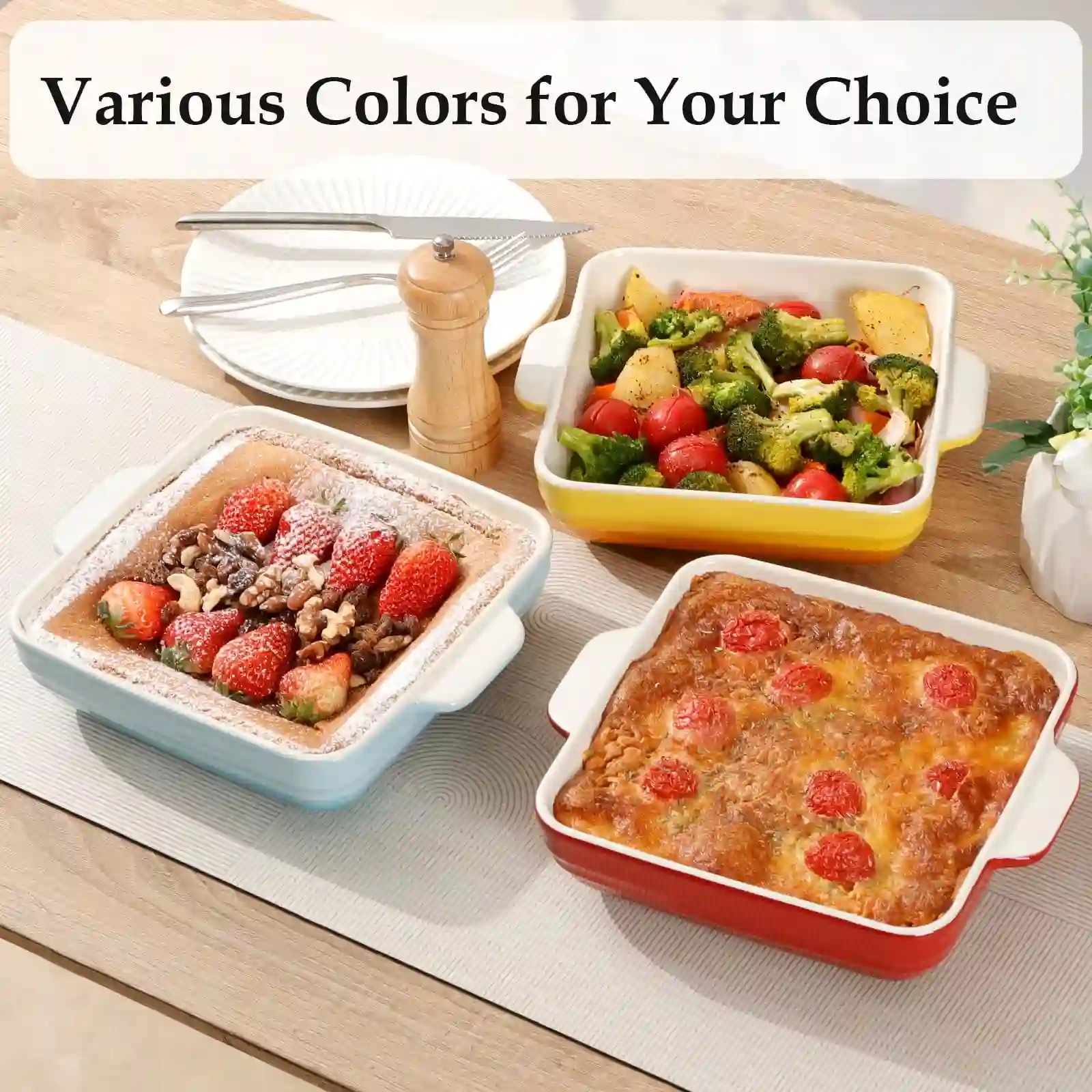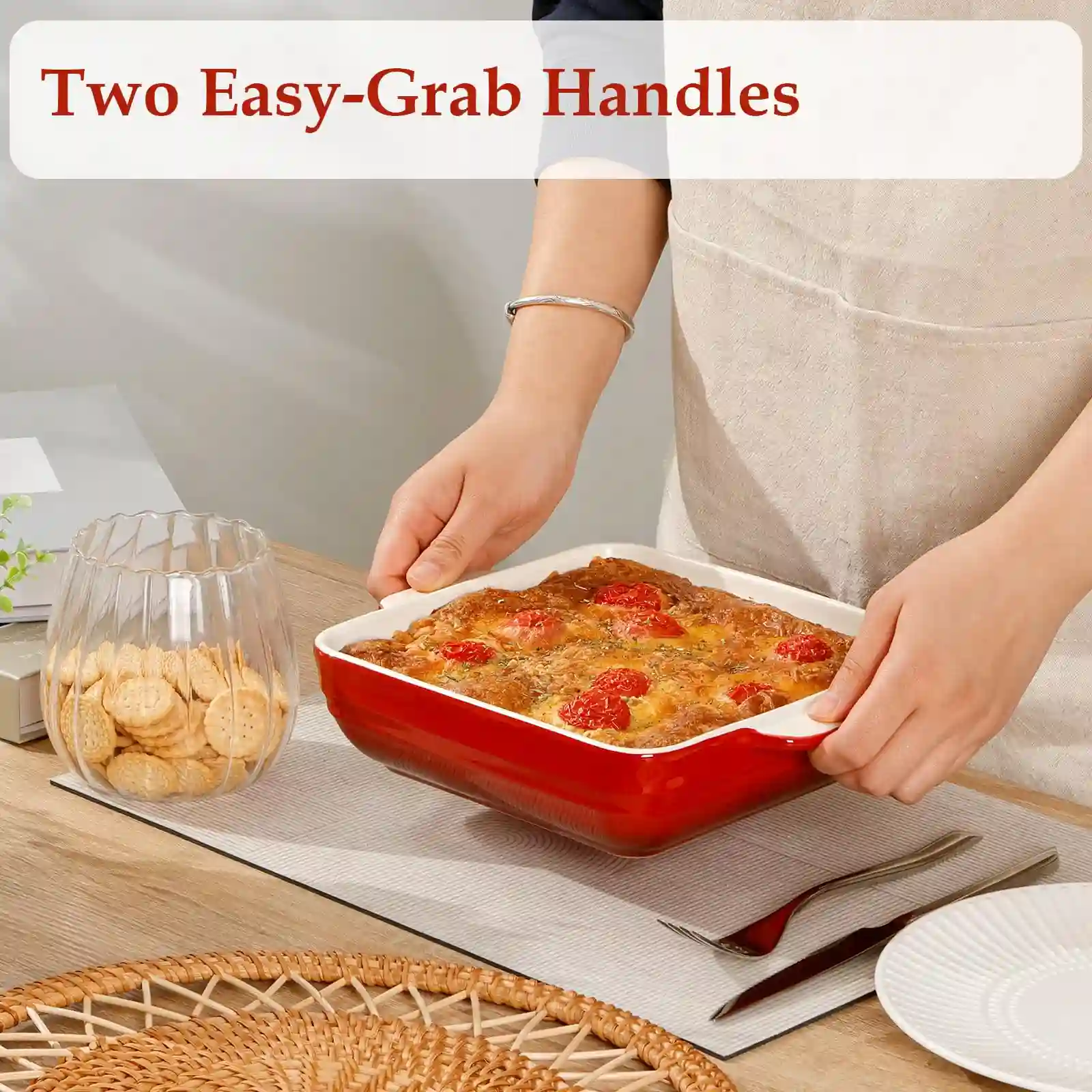 - Classic Square Shape: These classic square designs of red ceramic baking dish wholesale can maximise the use of oven space, making them suitable for grilling vegetables, meat, baked pastries, and more. The white handles on both sides are easy to pick up, reducing the risk of burns.