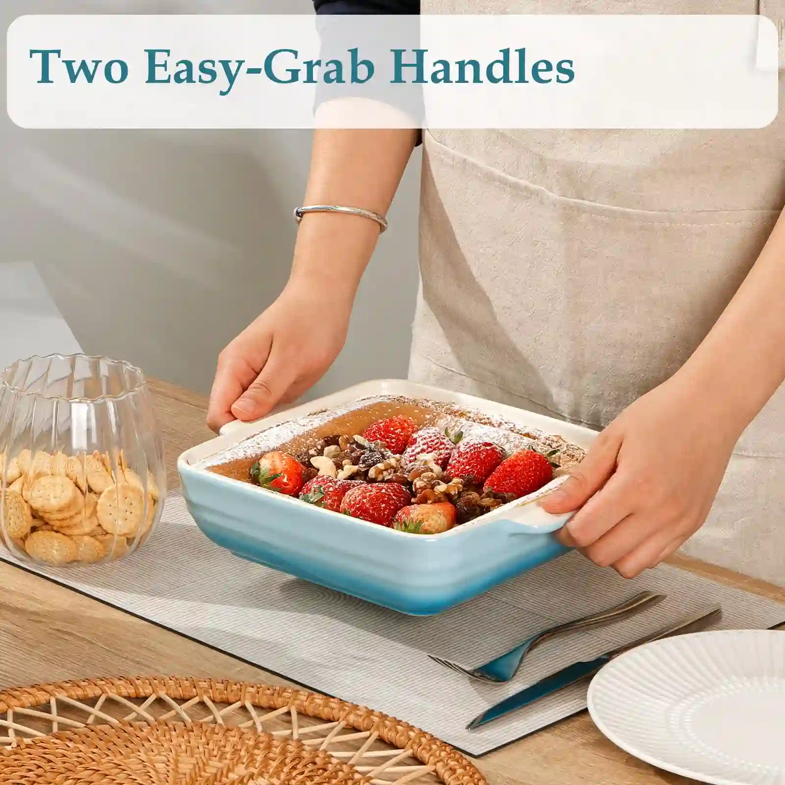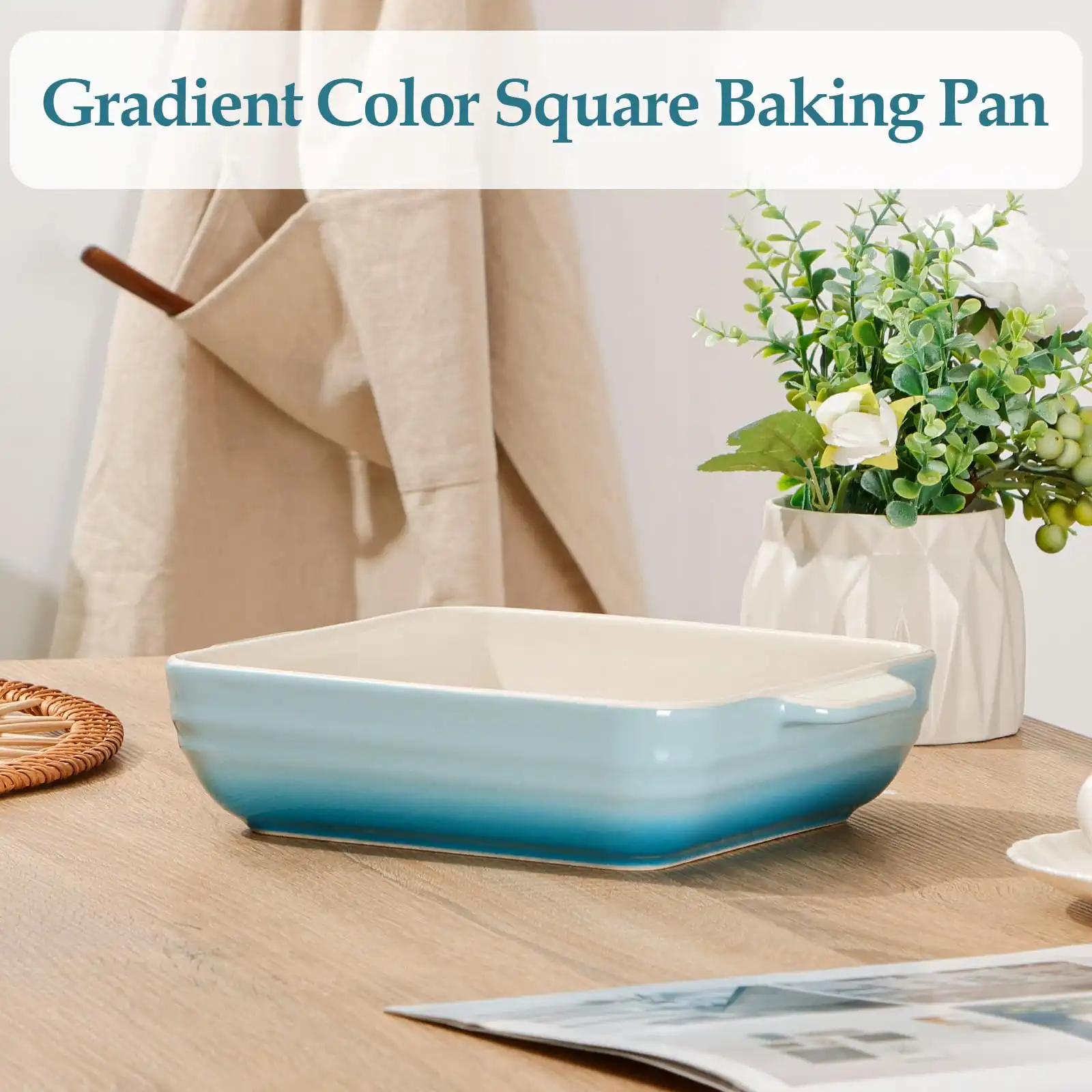 - Fresh Colors: This square ceramic baking dish wholesale adopt a color scheme of blue gradient and white inner glaze. The blue gradually becomes lighter from the bottom to the edge, with a natural and layered transition, visually refreshing and elegant, adding a touch of dynamic color to the kitchen and dining table.