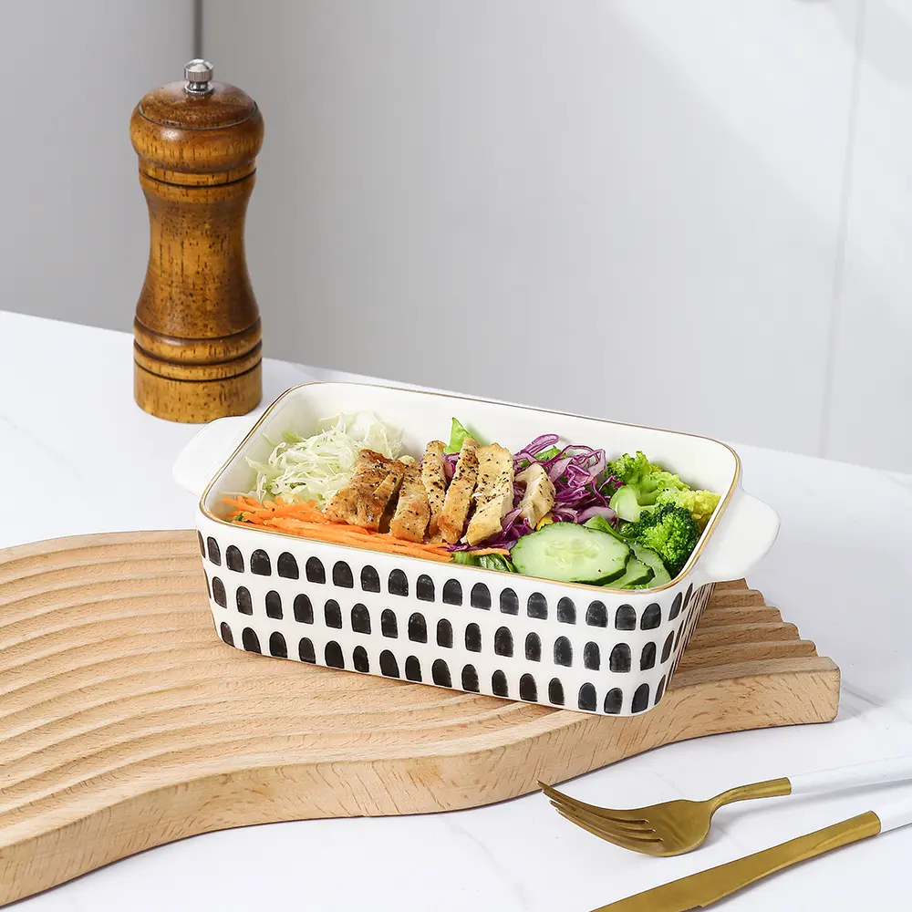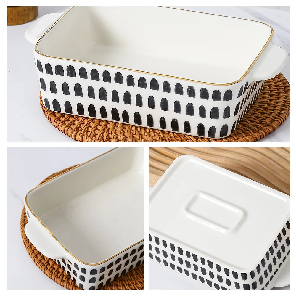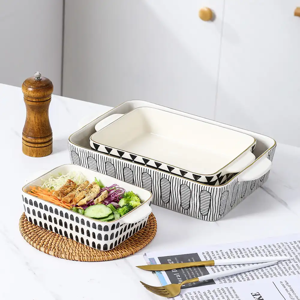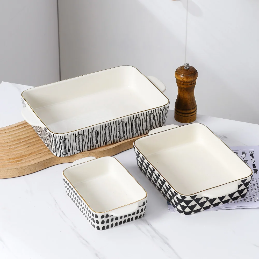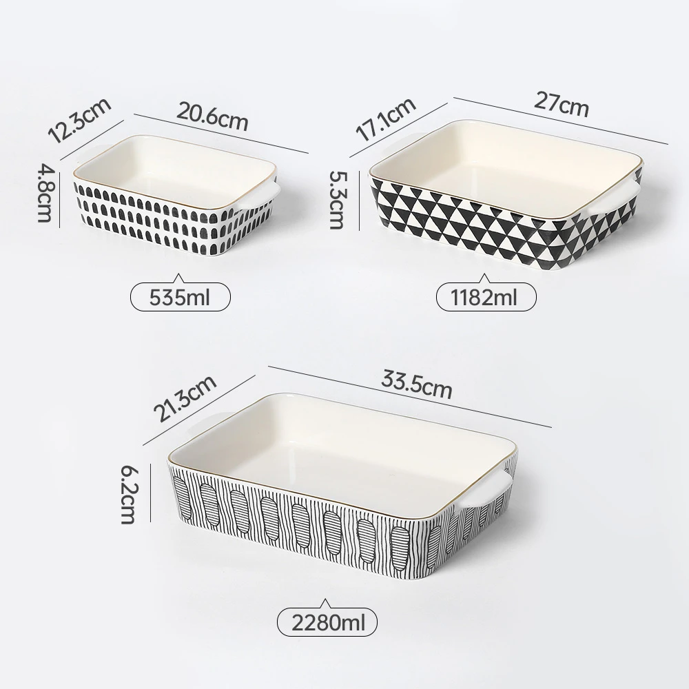 - Various Patterns: These 3-piece ceramic baking dishes wholesale are kindly provided with black geometric patterns on the surface, such as regularly adagios arch shaped, triangular grid, and lines with ellipses. These design patterns are very modern art styles and can add a unique visual flavor to the baking pan.