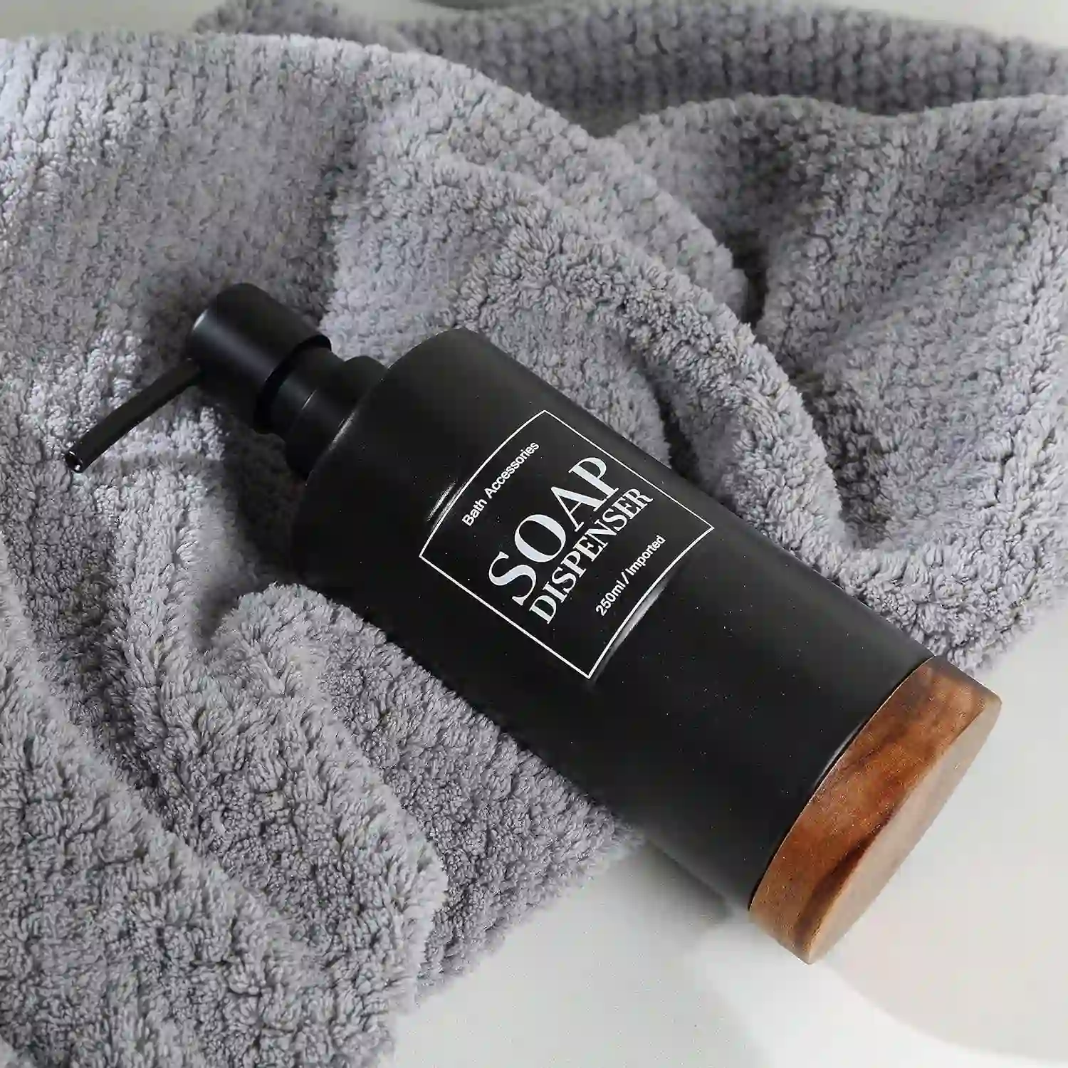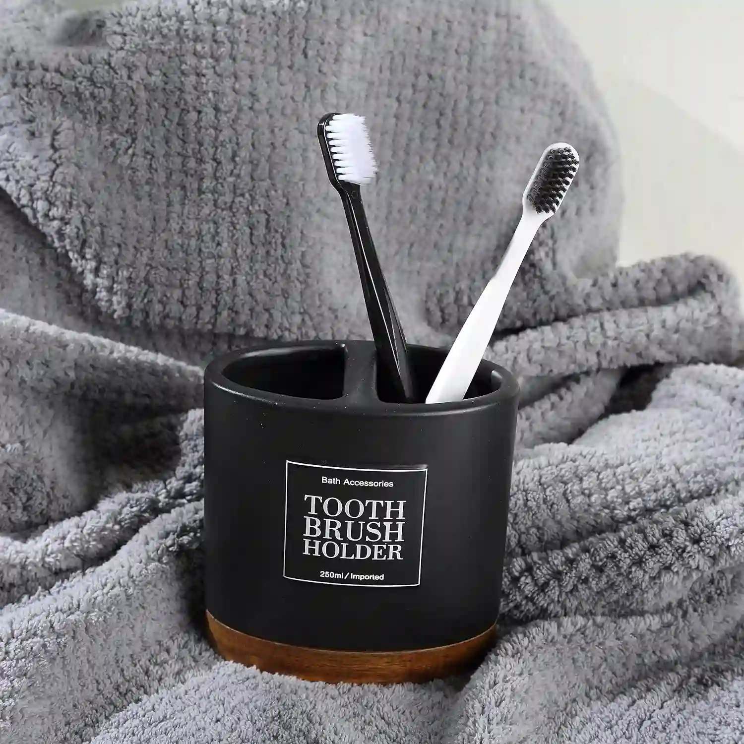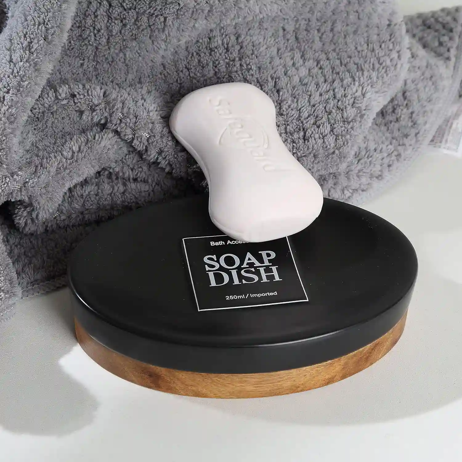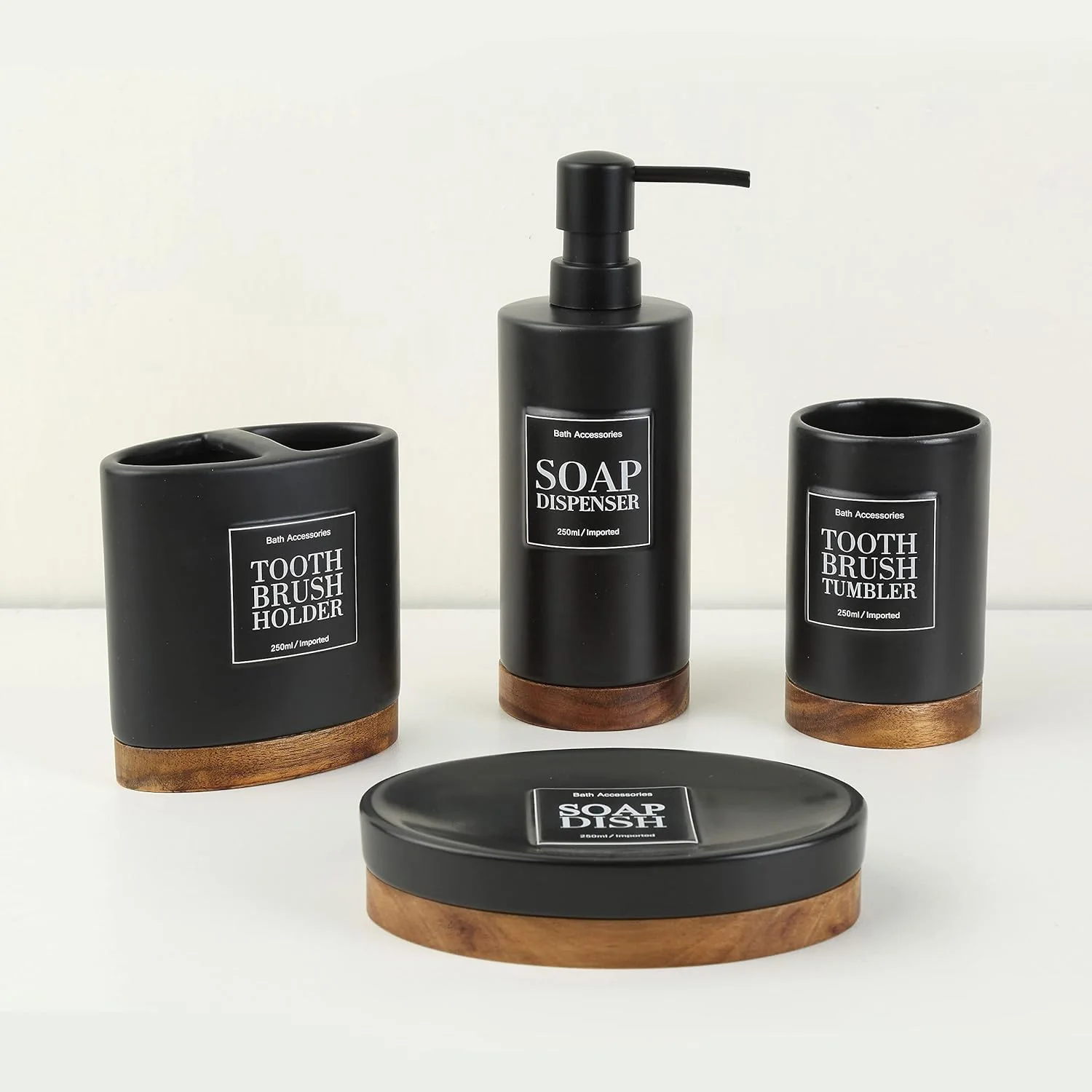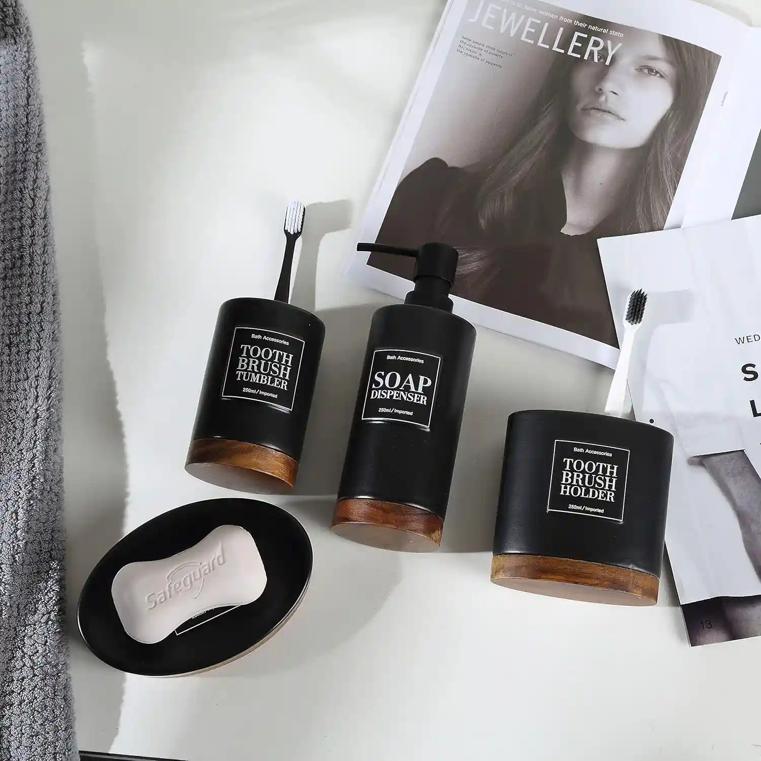- Wooden Base: These bath accessories custom feature a combination of matte black ceramic and natural wood grain base. The addition of wooden elements adds a natural and warm feeling to the entire set, avoiding the cold hardness of pure black and enhancing the visual level through material contrast, making the set more artistic.