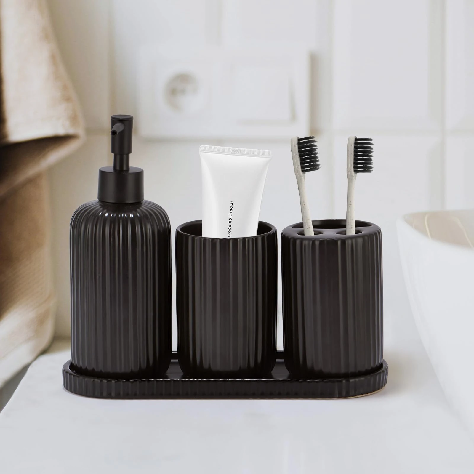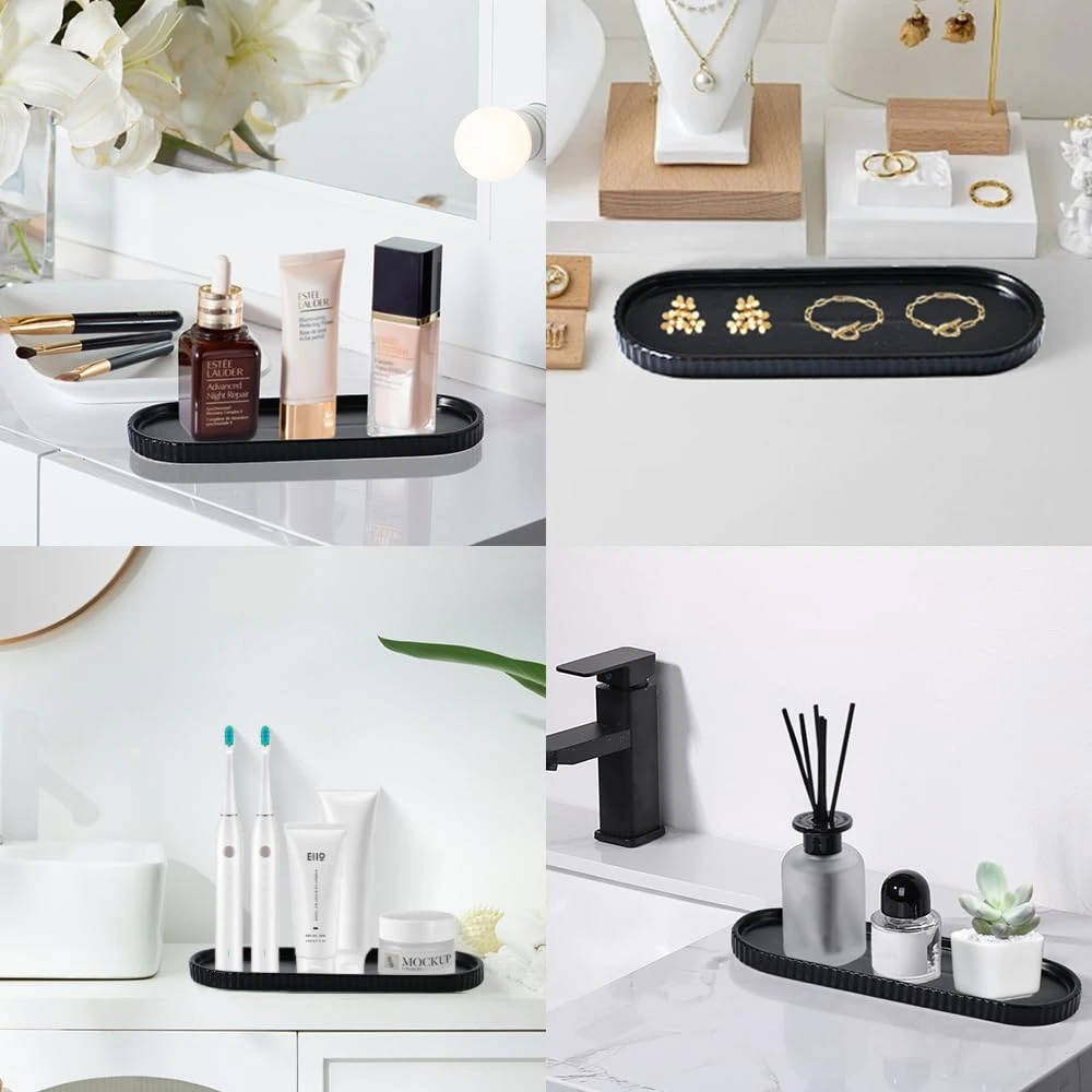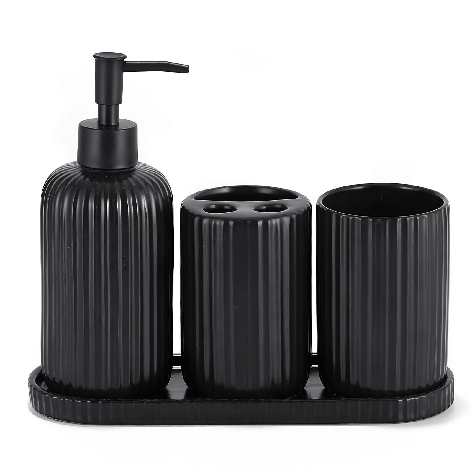 - Alta practicidad: The bulk matte black bathroom set includes fully functional soap dispensers, toothbrush holders, mouthwash cups, and trays. which features a separate compartment for toothpaste, and a large storage area that can hold multiple toothbrushes. The tray can hold the bathroom accessories, and is also great for watches, jewelry, and perfume.