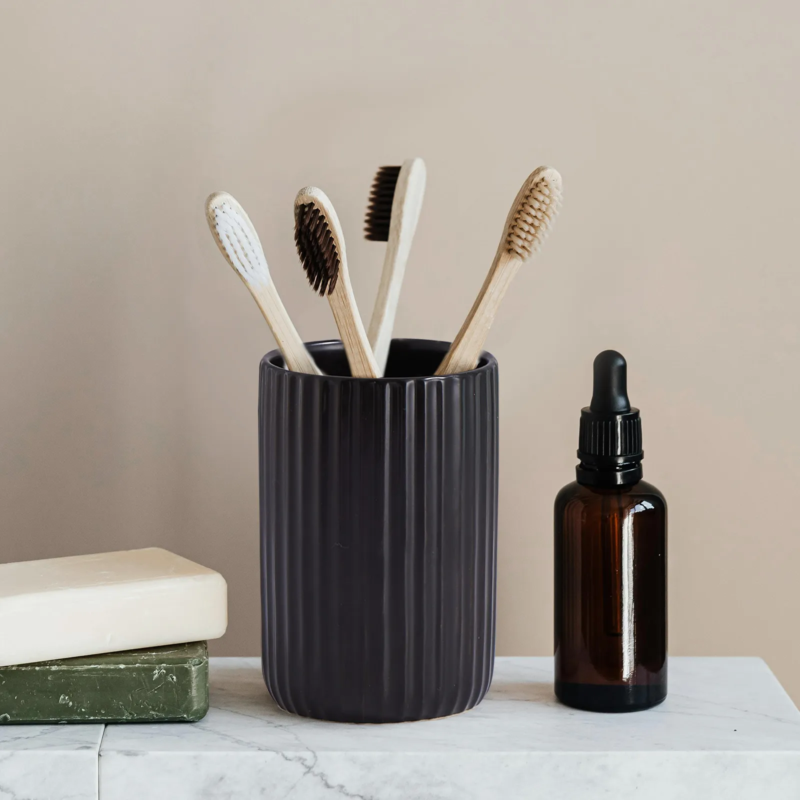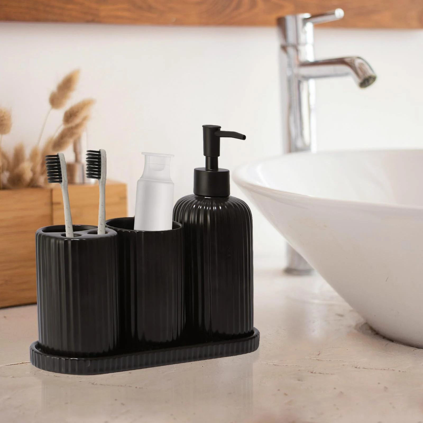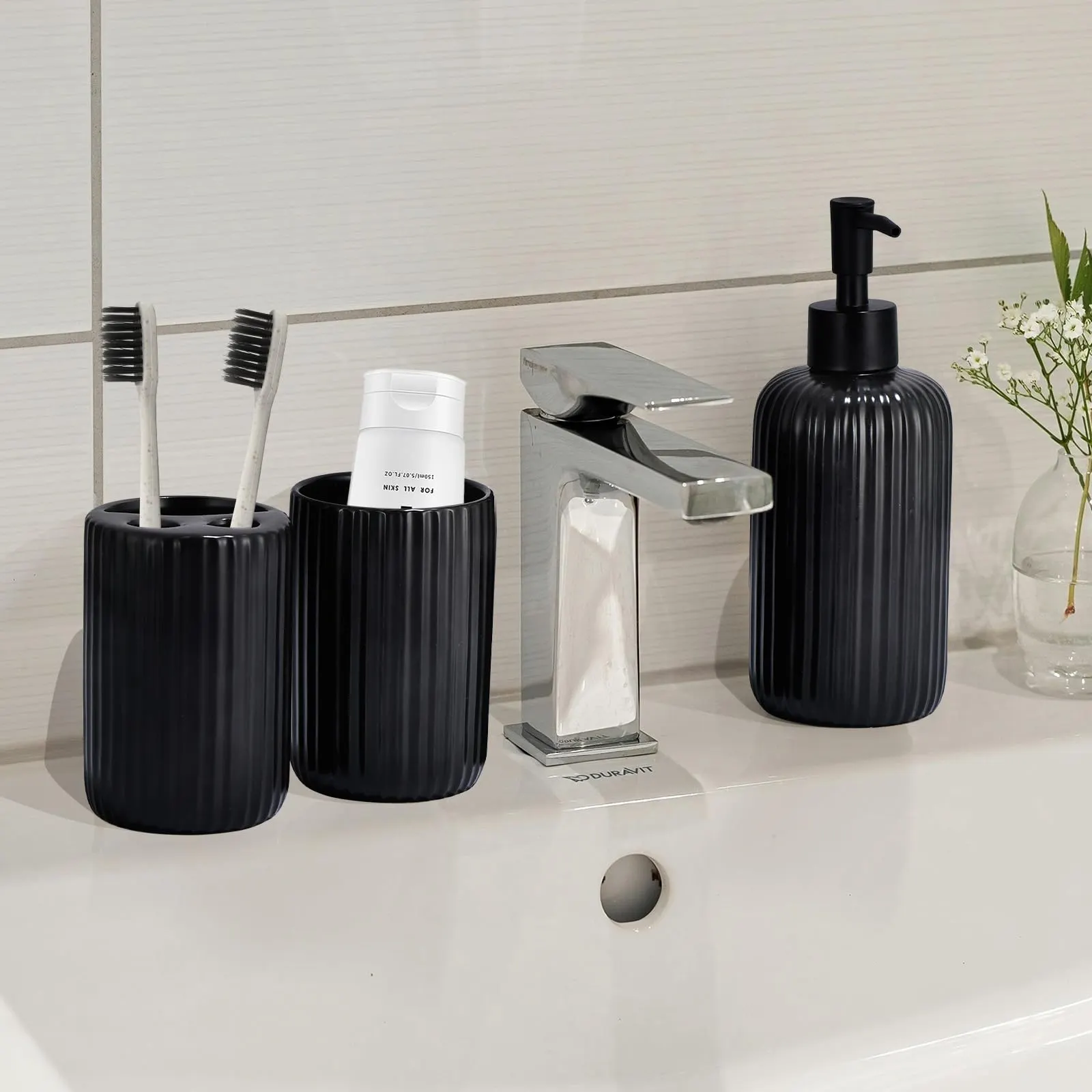 - Alta practicidad: The bulk matte black bathroom set includes fully functional soap dispensers, toothbrush holders, mouthwash cups, and trays. which features a separate compartment for toothpaste, and a large storage area that can hold multiple toothbrushes. The tray can hold the bathroom accessories, and is also great for watches, jewelry, and perfume.