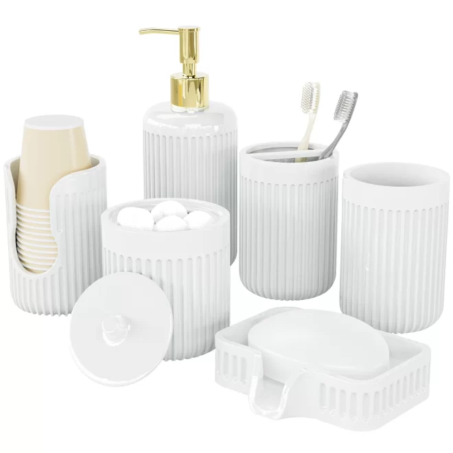 - Diseño elegante: This wholesale designer bathroom set is in a pure and versatile white color, with delicate vertical stripe textures on the surface, adding a sense of layering to the product and making the overall look less monotonous, more design-oriented, and artistic.