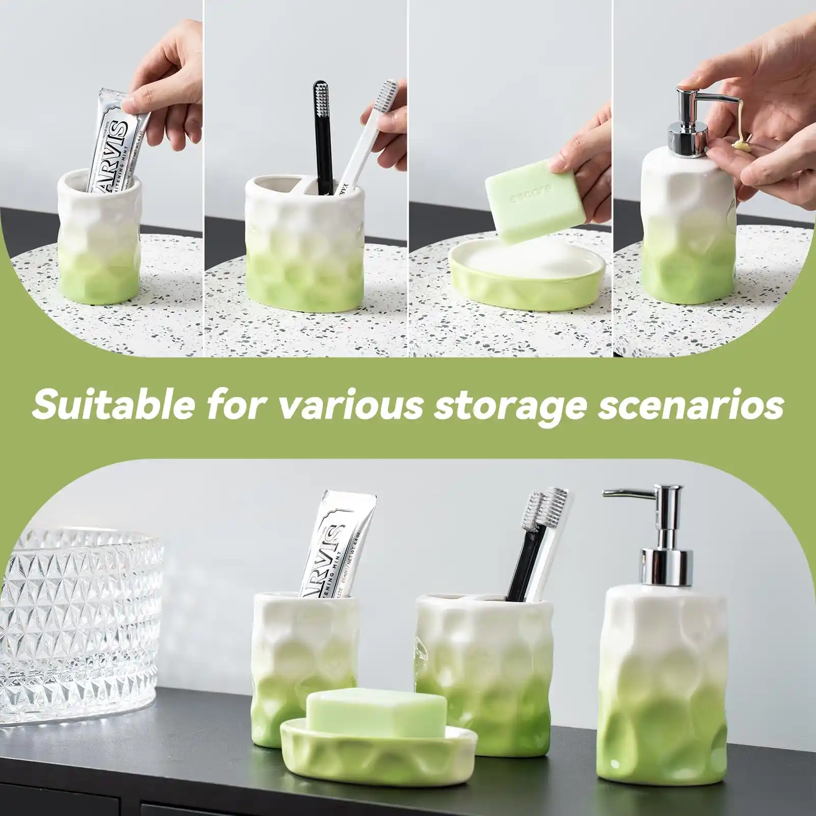 - Fresh Colors: These bulk custom ceramic bathroom accessories feature a gradient green design, from green at the bottom to white. The color is fresh and elegant, giving a natural and comfortable feeling, creating a peaceful and relaxing atmosphere for the bathroom.