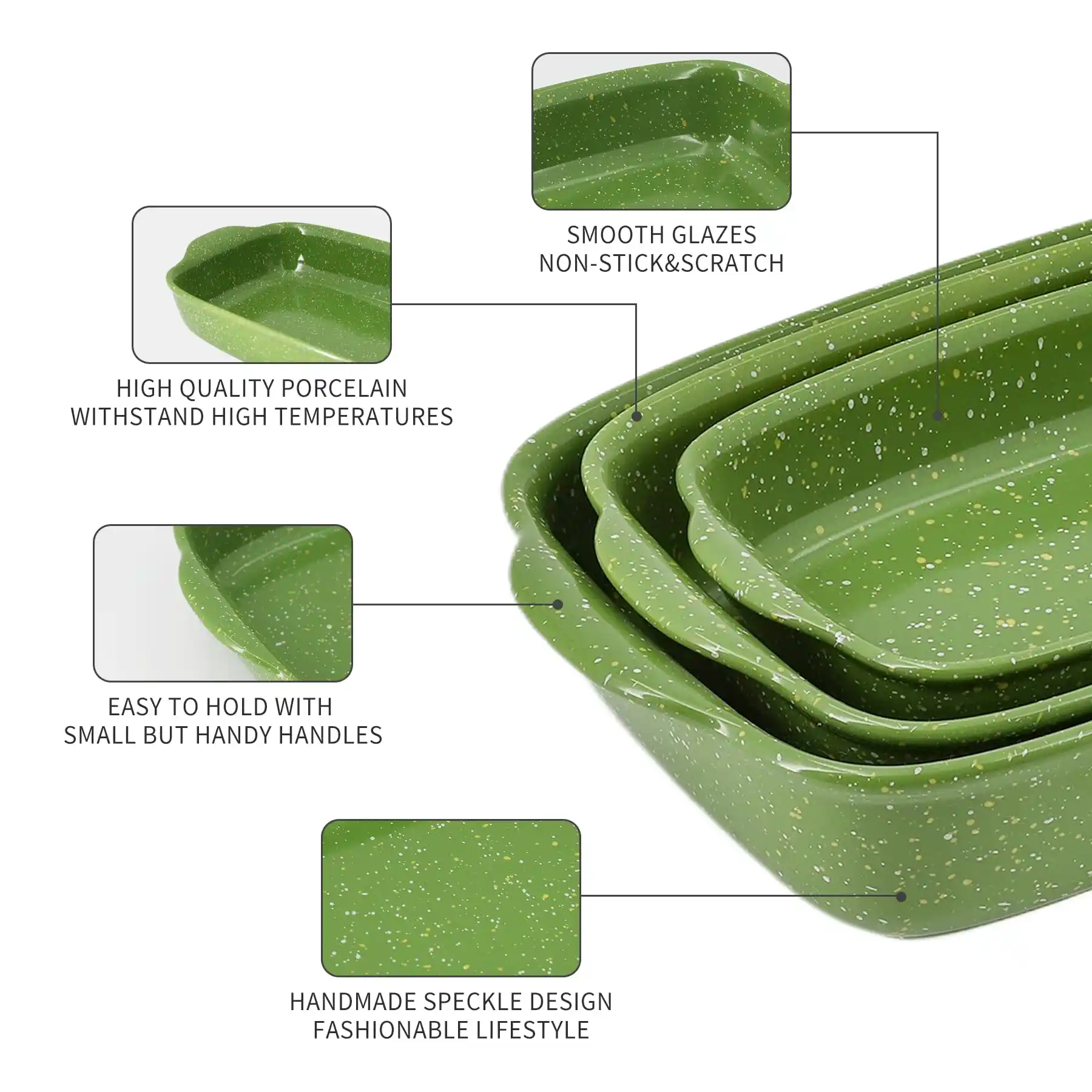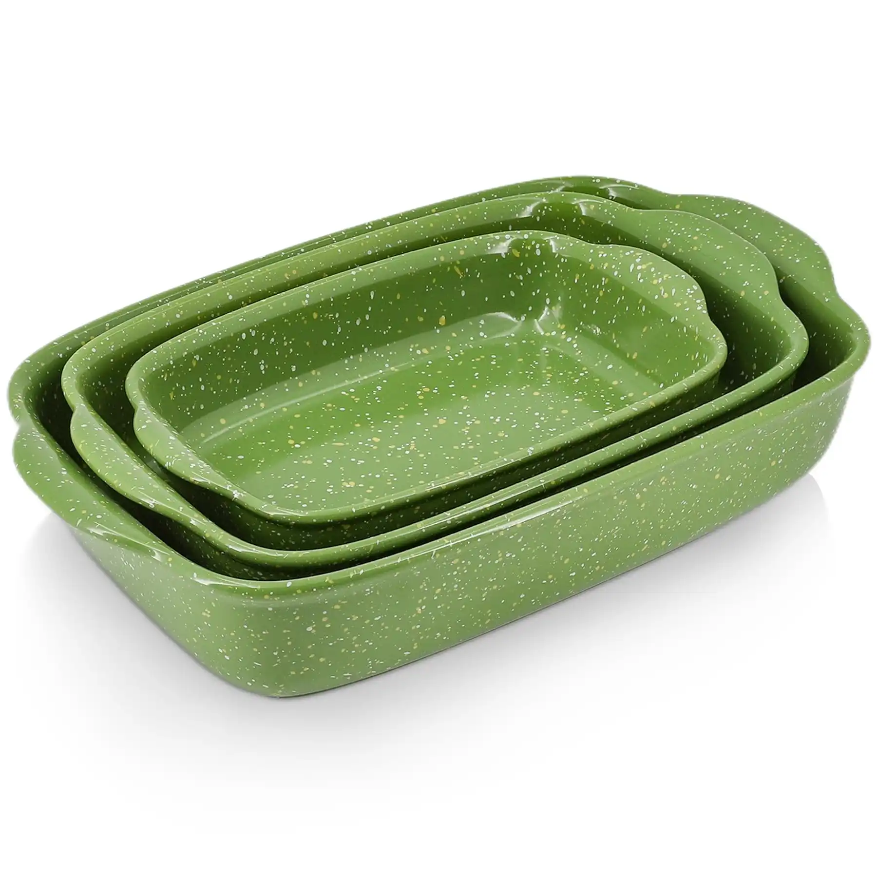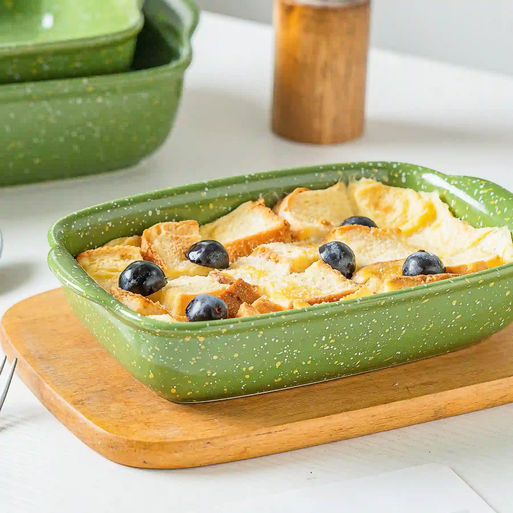 - Fresh Colors: These custom ceramic baking pans are fresh green with irregular white and yellow spots, presenting a natural and lively visual effect that adds a sense of brightness to the dining table and kitchen, and enhances the joy of cooking and dining.