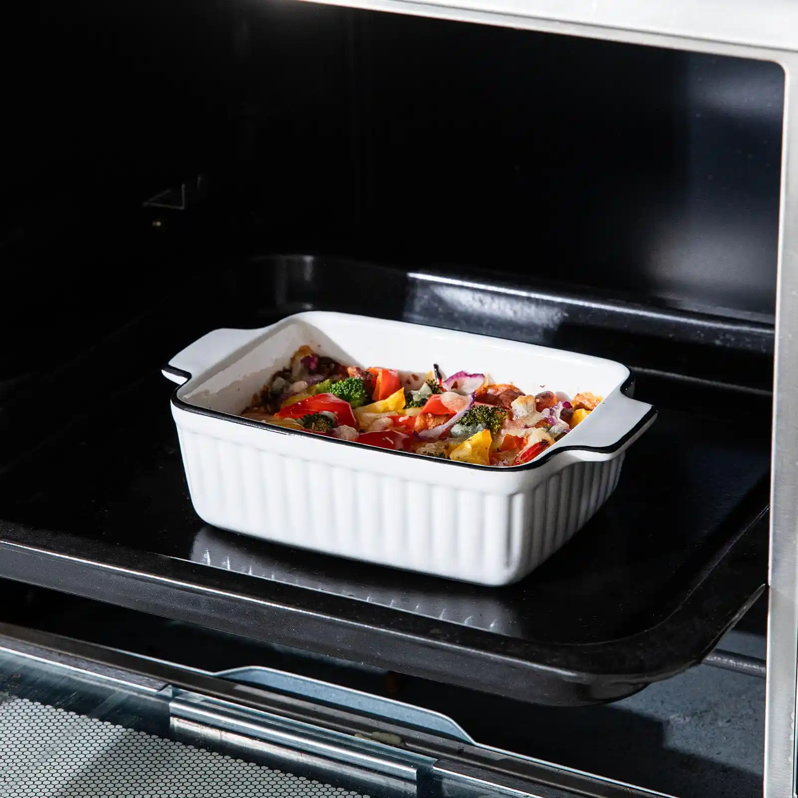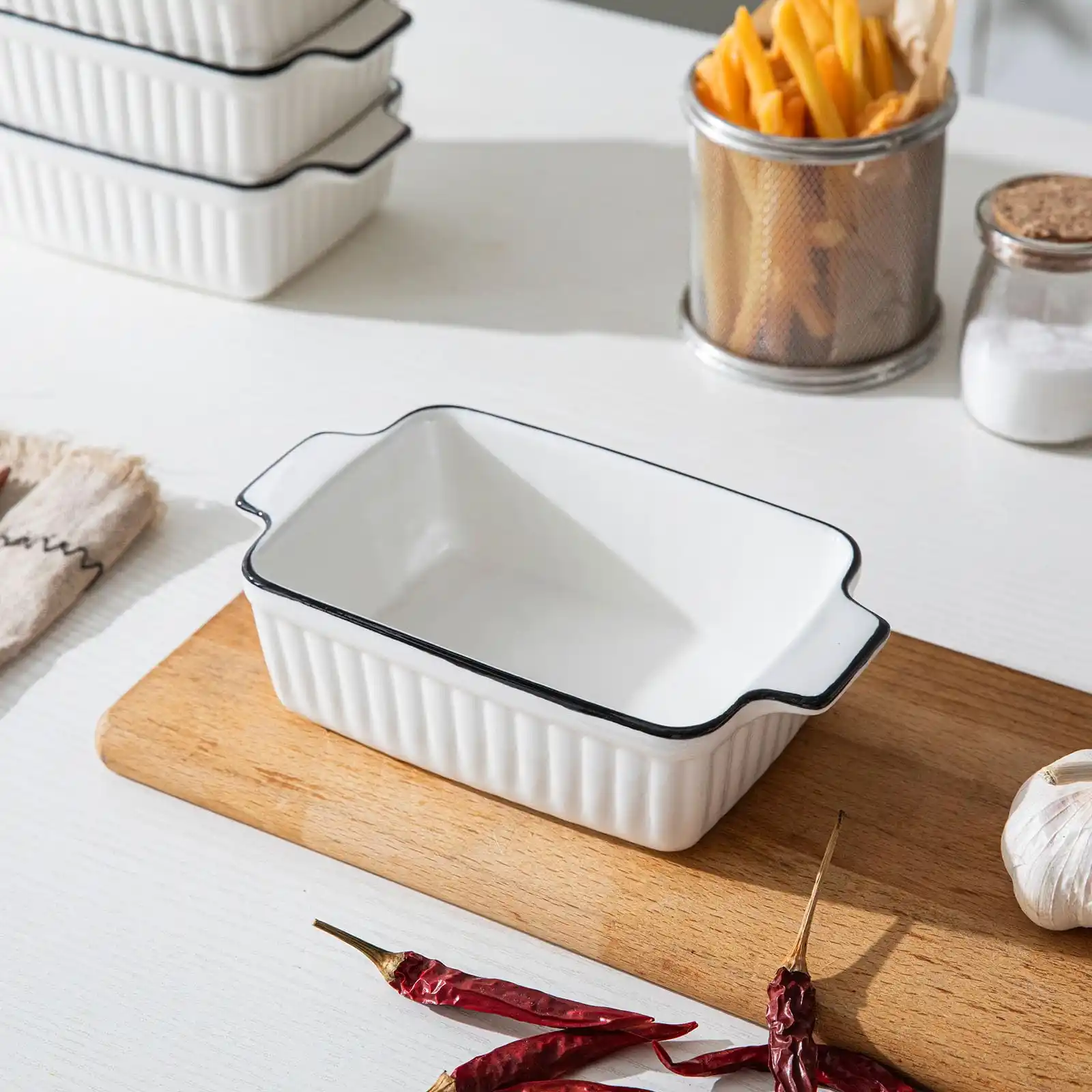 - Design élégant : These custom small ceramic baking pans feature a white colour scheme with black borders, combined with vertical striped textures on the sides, creating a combination of retro and minimalist feel. The black borders enhance visual refinement, while the striped design increases grip friction and adds layers to the appearance.