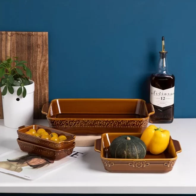 - Différentes tailles : This ceramic baking dish wholesale has three sizings, from large to small, so it can avail the needs of different baked goods, whether it is for a big family gathering or just for a small scale of meals. When not in use, the baking dishes can be stacked to save cabinet space.
