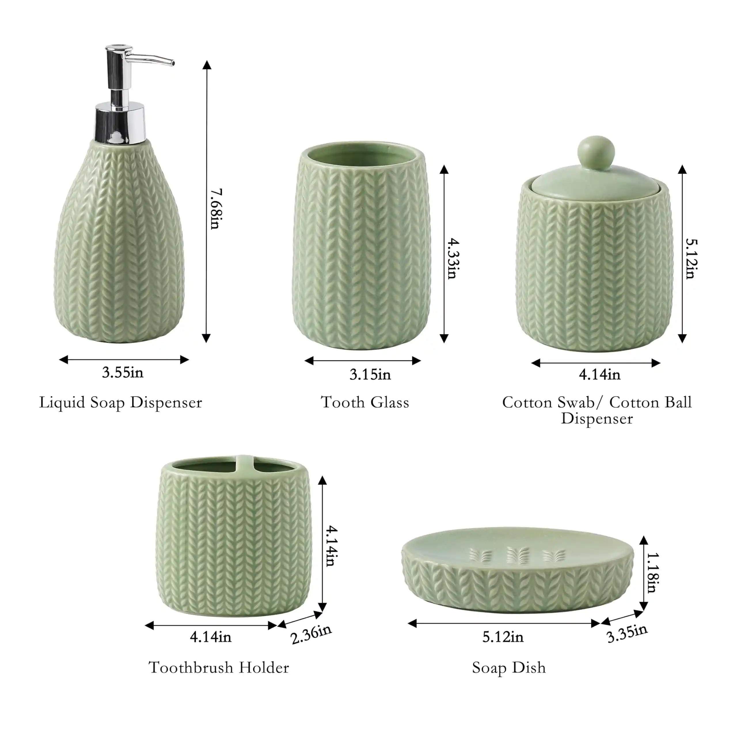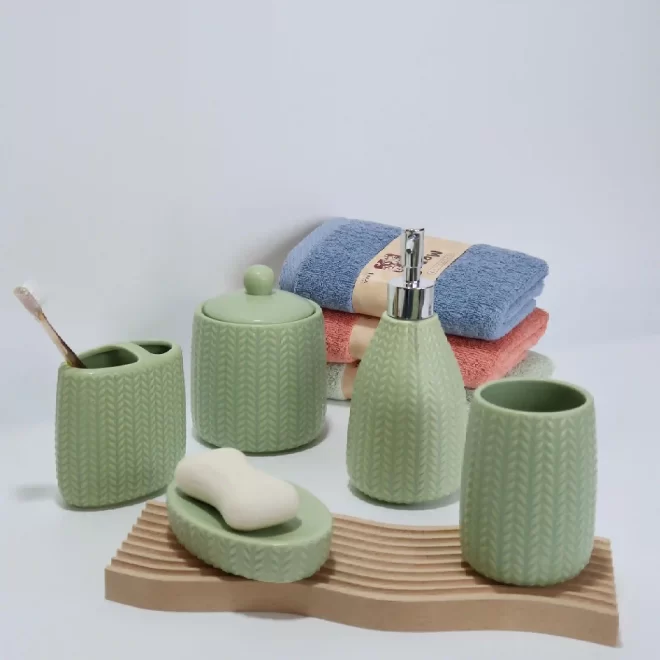 Welcome to purchase our green bathroom set wholesale, combining practicality and aesthetics, not only enhancing the bathroom style with a fresh and soft style, but also making the washing process more convenient through scientific storage. Made from durable high-temperature ceramic, it’s easy to clean, moisture-resistant, and ideal for hotels, retailers, and home décor brands.
