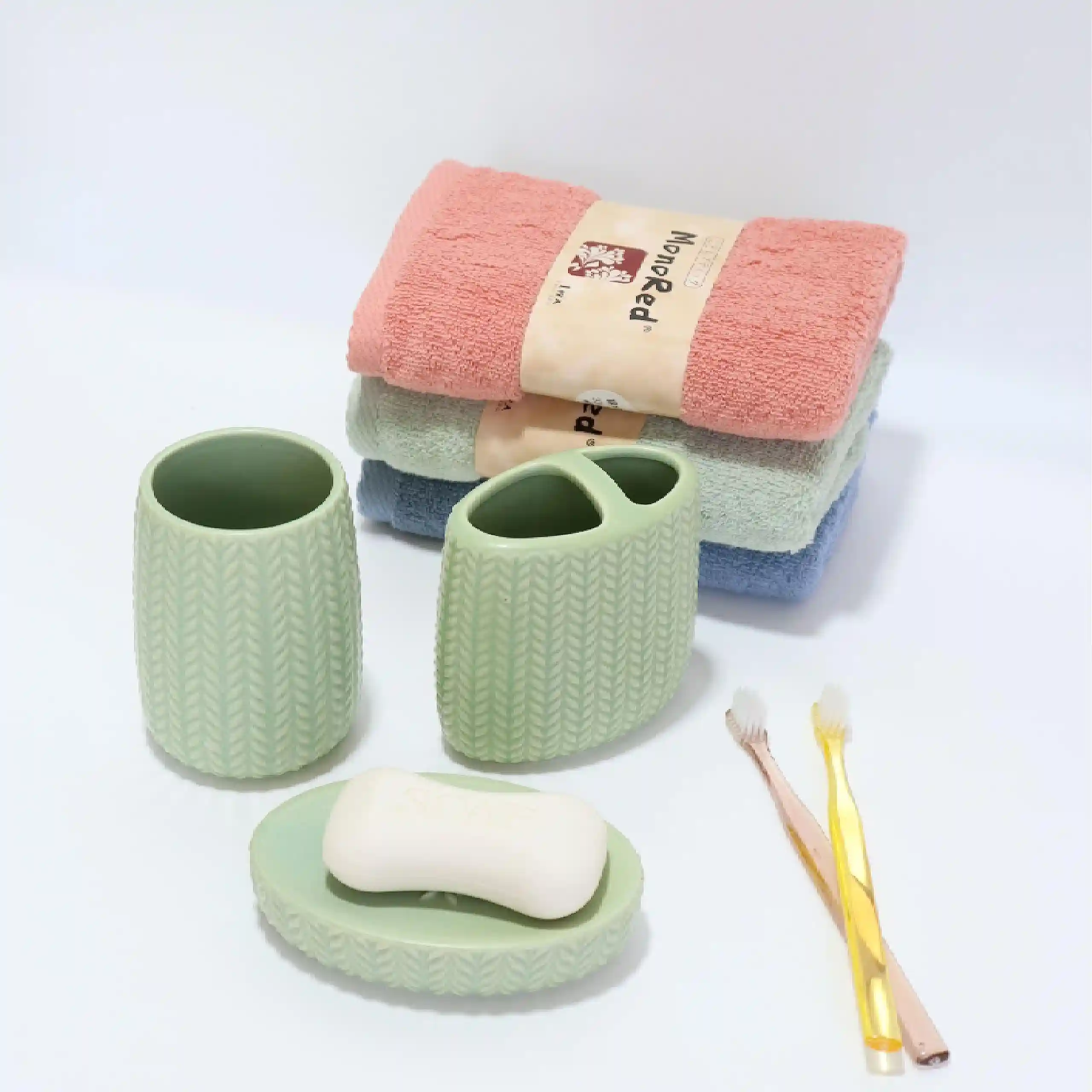 - Fresh Style: This green bathroom set wholesale features a soft light green color scheme, with a fresh and healing style. The texture resembling wheat ears on the surface adds visual layering, making the set look more exquisite and high-end.