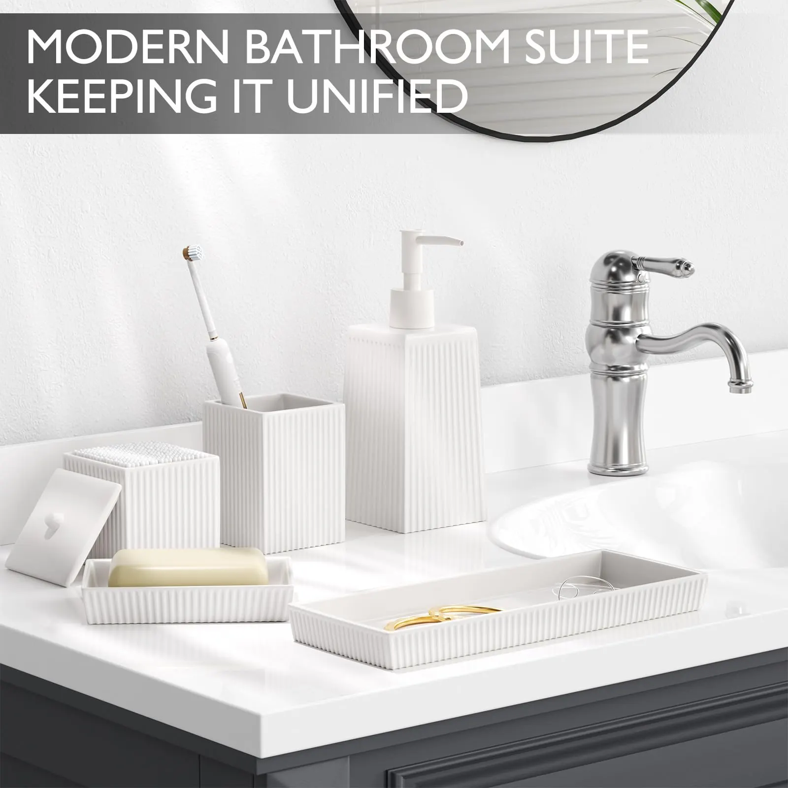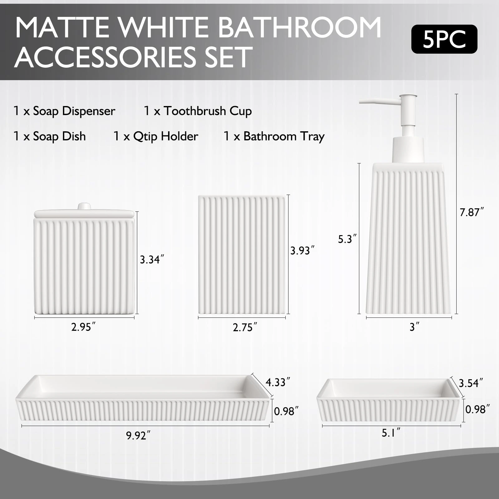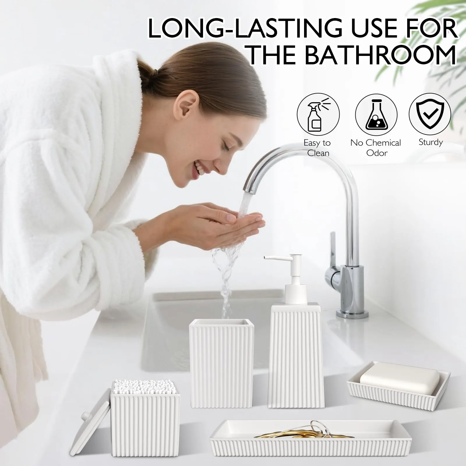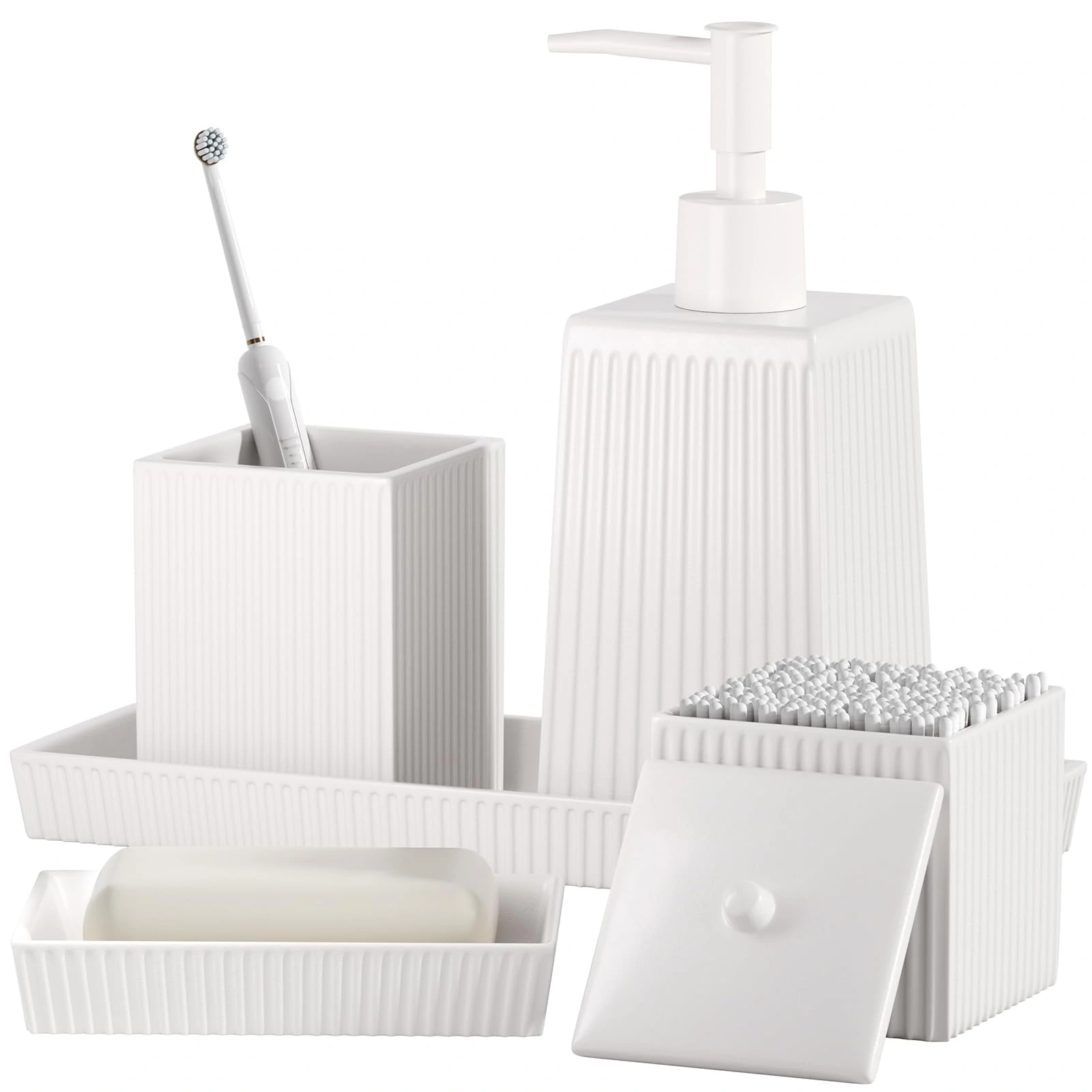 - モダンなデザイン: These hotel bathroom accessories set wholesale have a simple and elegant pure white color scheme, with delicate vertical stripe textures on the surface, adding visual layering and delicacy, without appearing monotonous.