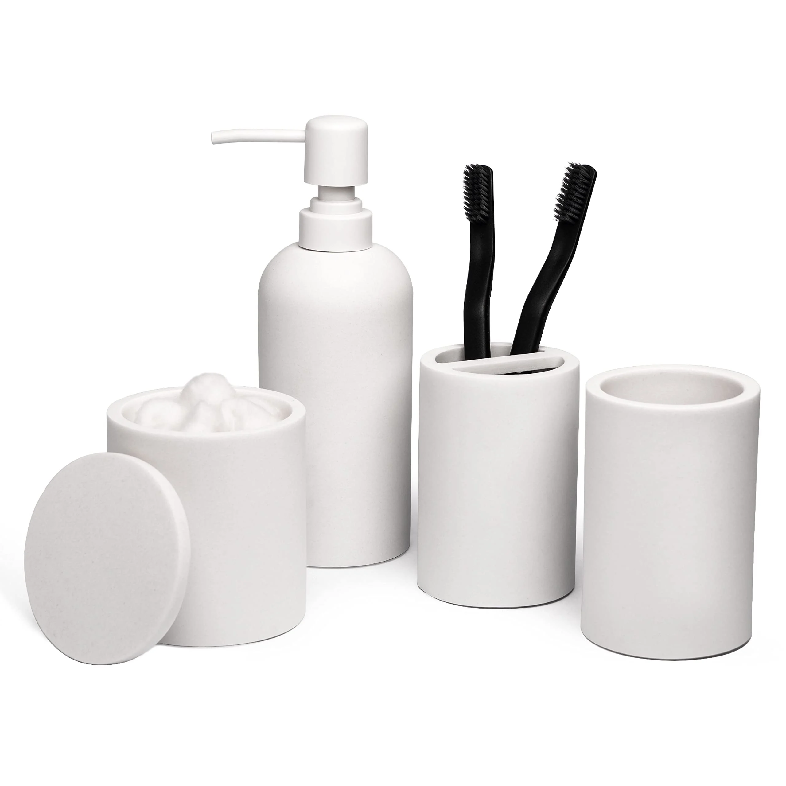 - コンプリート・セット: The white ceramic bathroom set wholesale comes with all of the essentials needed for any bathroom, including a soap dispenser, storage jars, tooth brush holders and mouthwash cups. This set will help keep all of your items neatly organized, such as hand sanitisers, cotton balls, toothbrushes and toothpaste, etc.
