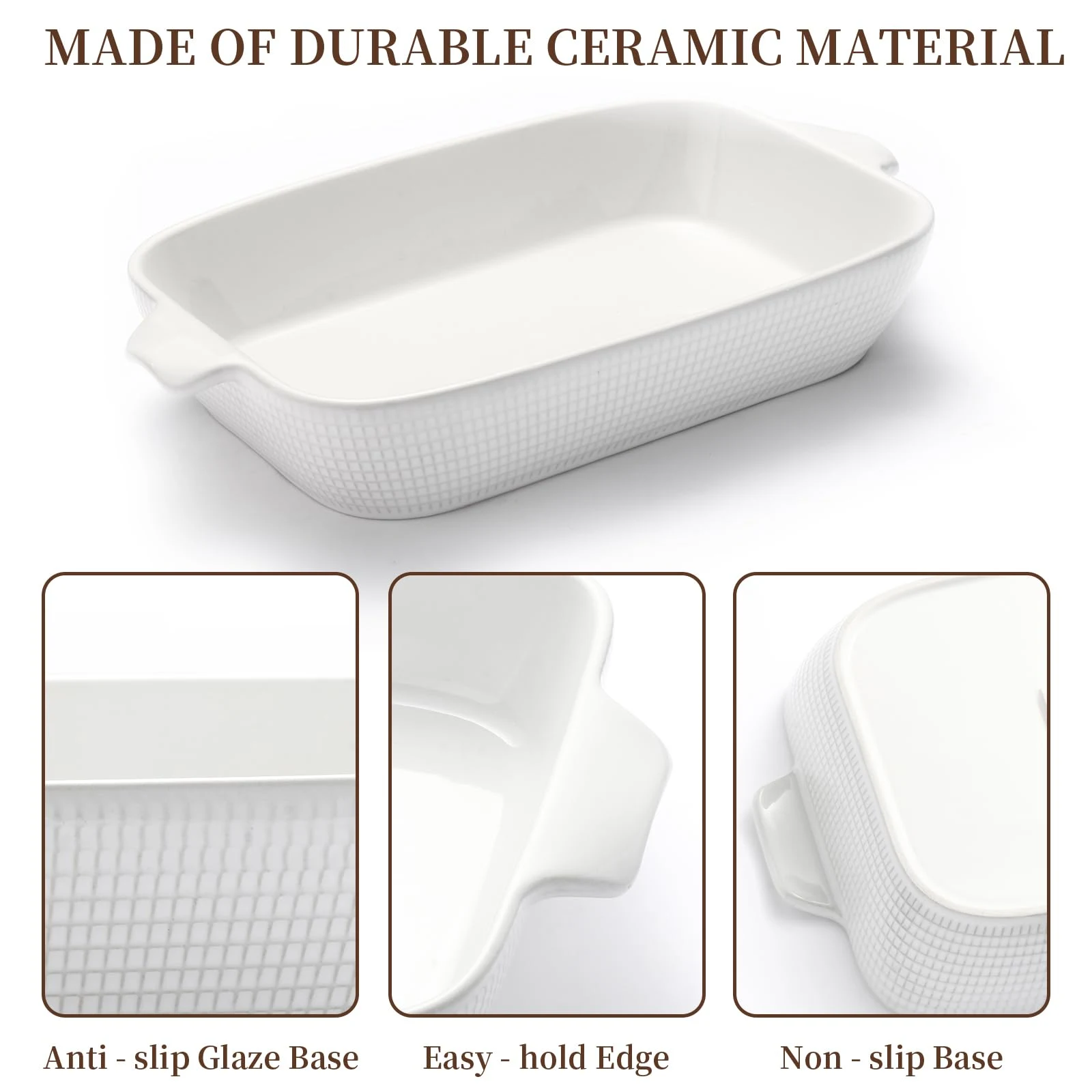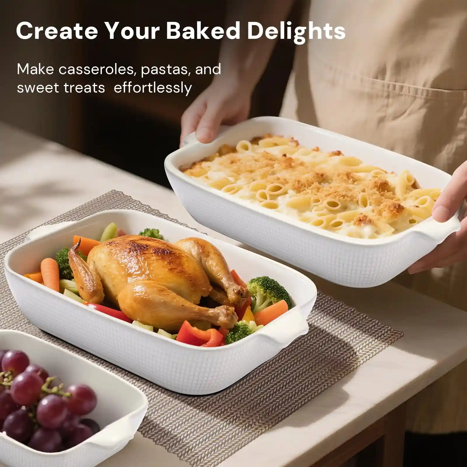 - エレガントなデザイン: These wholesale baking dish sets are made in the classic white color, simple and elegant, and can easily blend into any kitchen decoration style and table setting. Fine grid patterns on the surface of the baking dish provide the visual layering and make the baking dish appear more classy.