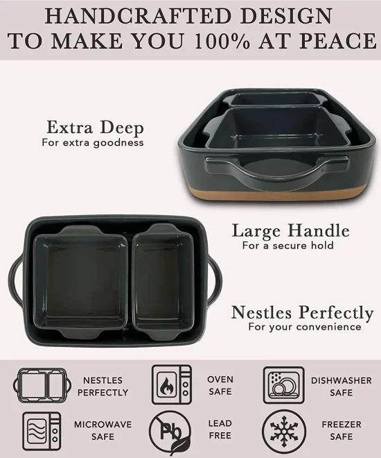 - Convenient Handles & Stackable: These ceramic wholesale baking pans come with two handles that make handling and movement easier to avoid burns; when not in use, the three sizes can be stacked for saving cabinet space.