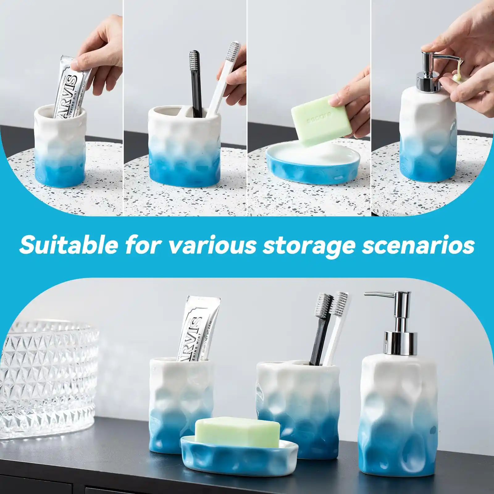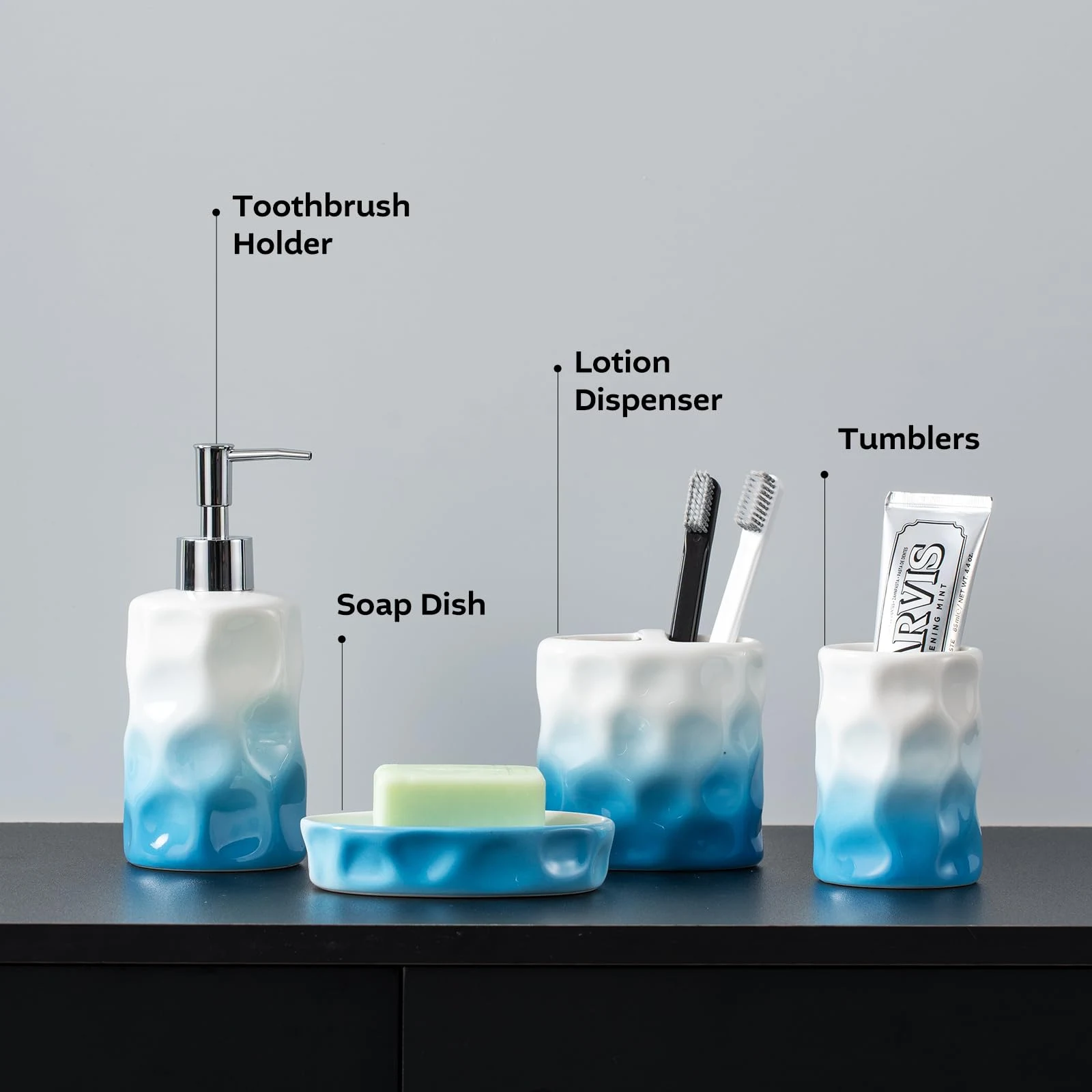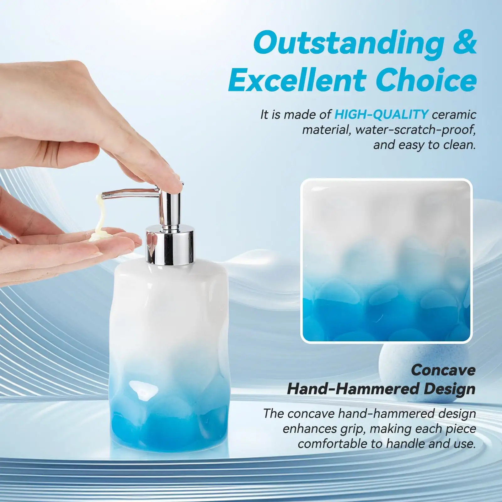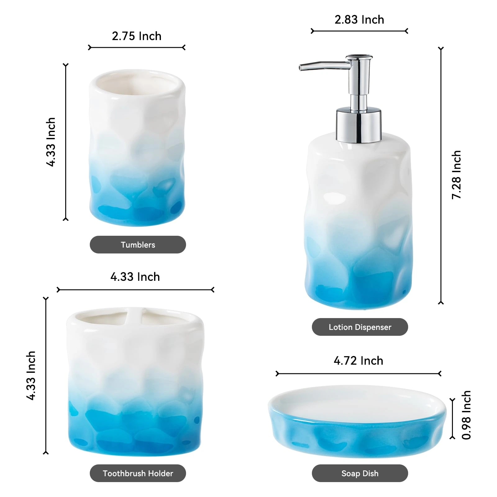 - Unique Texture: These bulk bathroom accessories wholesale are designed with irregular concave and convex textures on the surface, simulating the shape of water waves. Paired with the glossy glaze, they enhance the soft atmosphere of the “ocean style” and add a natural and artistic sense.