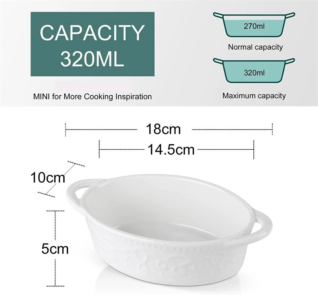 - Moderate Capacity: This oval casserole dish wholesale can be filled with 320ML, which can be considered a moderate capacity. It is suitable for individuals or a small family to cook. At the same time, they can be used to prepare several single portions for parties or banquets.