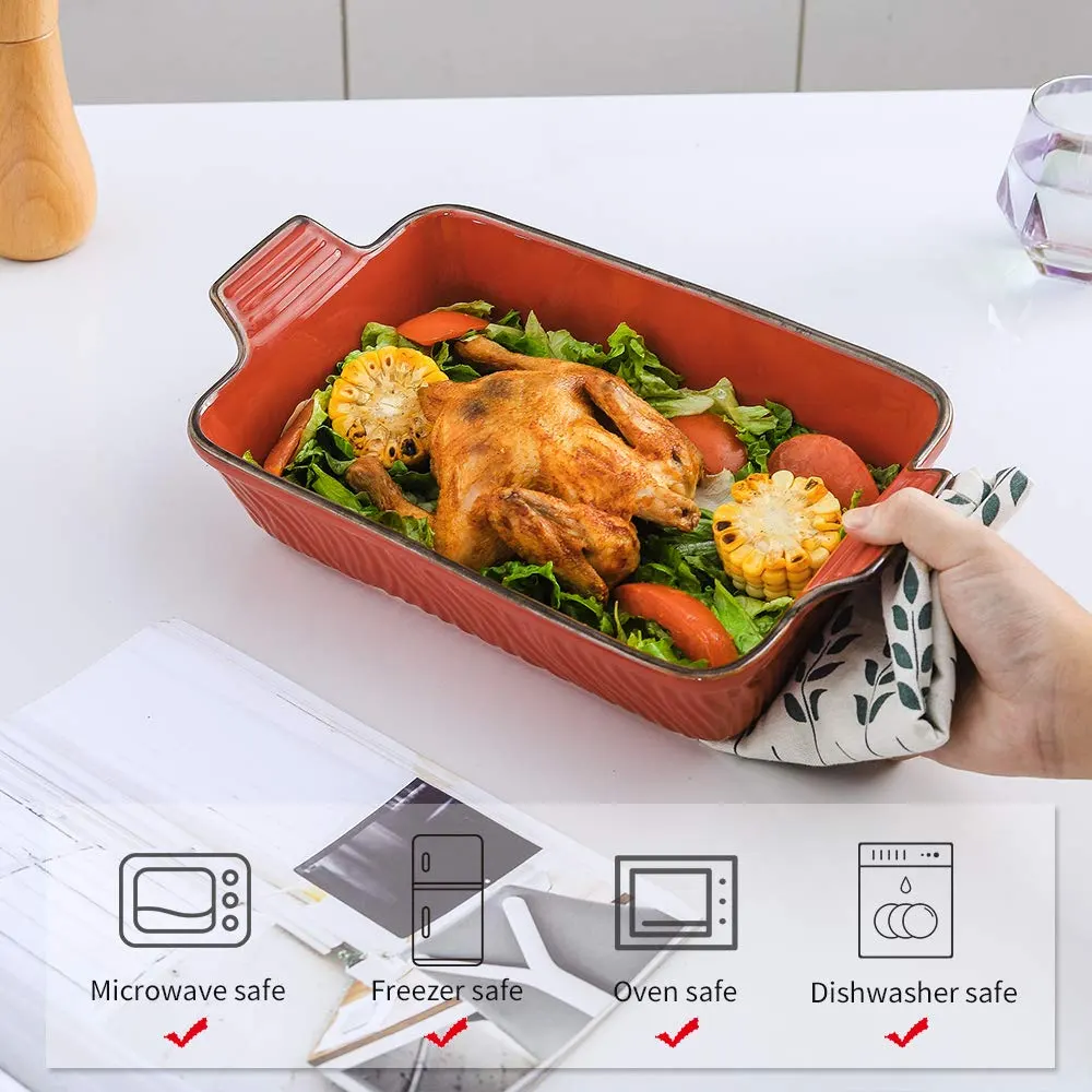 - Design elegante: These wholesale baking dish sets feature bright red colors, paired with dark brown lines at the edges, adding vitality to the kitchen and dining table. The side of the baking dish has a texture similar to water ripples, adding a sense of design and refinement.