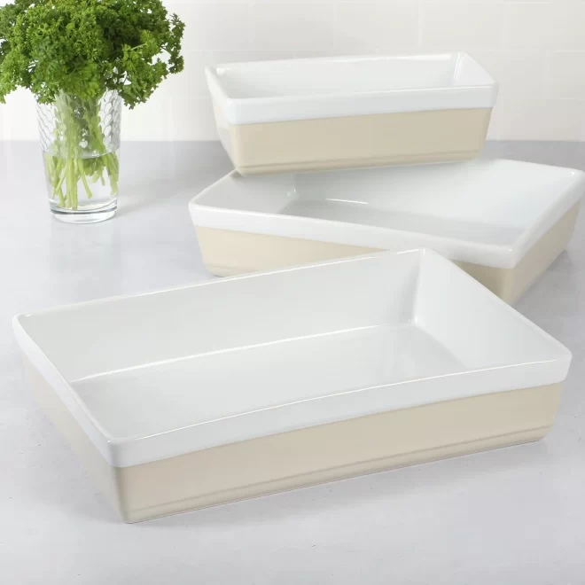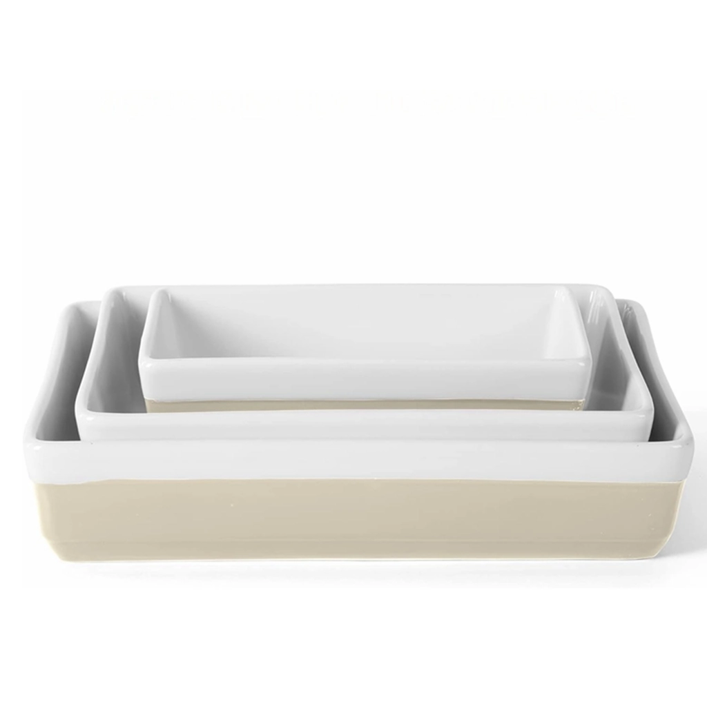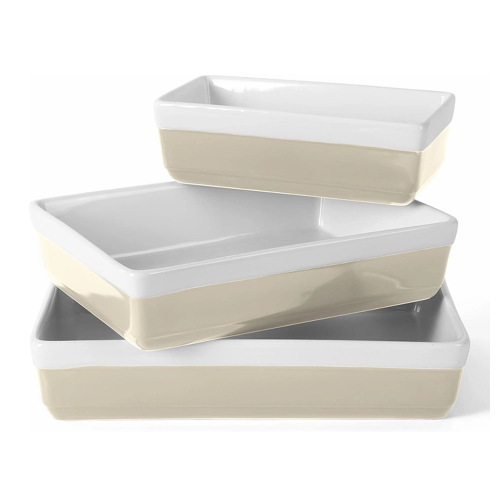 Welcome to purchase our beige and white contrasting custom ceramic baking pans, made of high-fired ceramics, ensuring the safety and health of the food. The oven-safe dish wholesale combines elegant design with excellent functionality, not only greatly enhancing the aesthetic value of the kitchen with their outstanding practicality and durability, making them an ideal choice for commercial baking, retail cookware collections, and private label kitchenware brands.